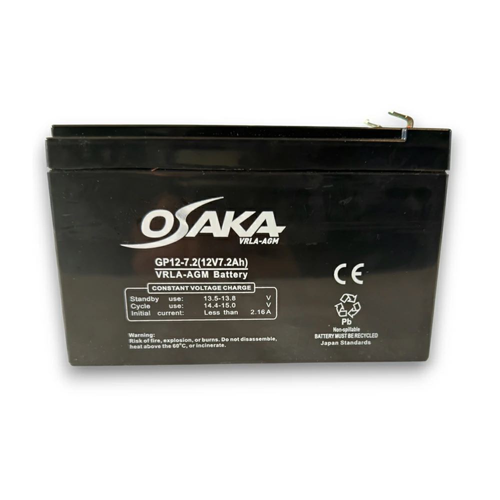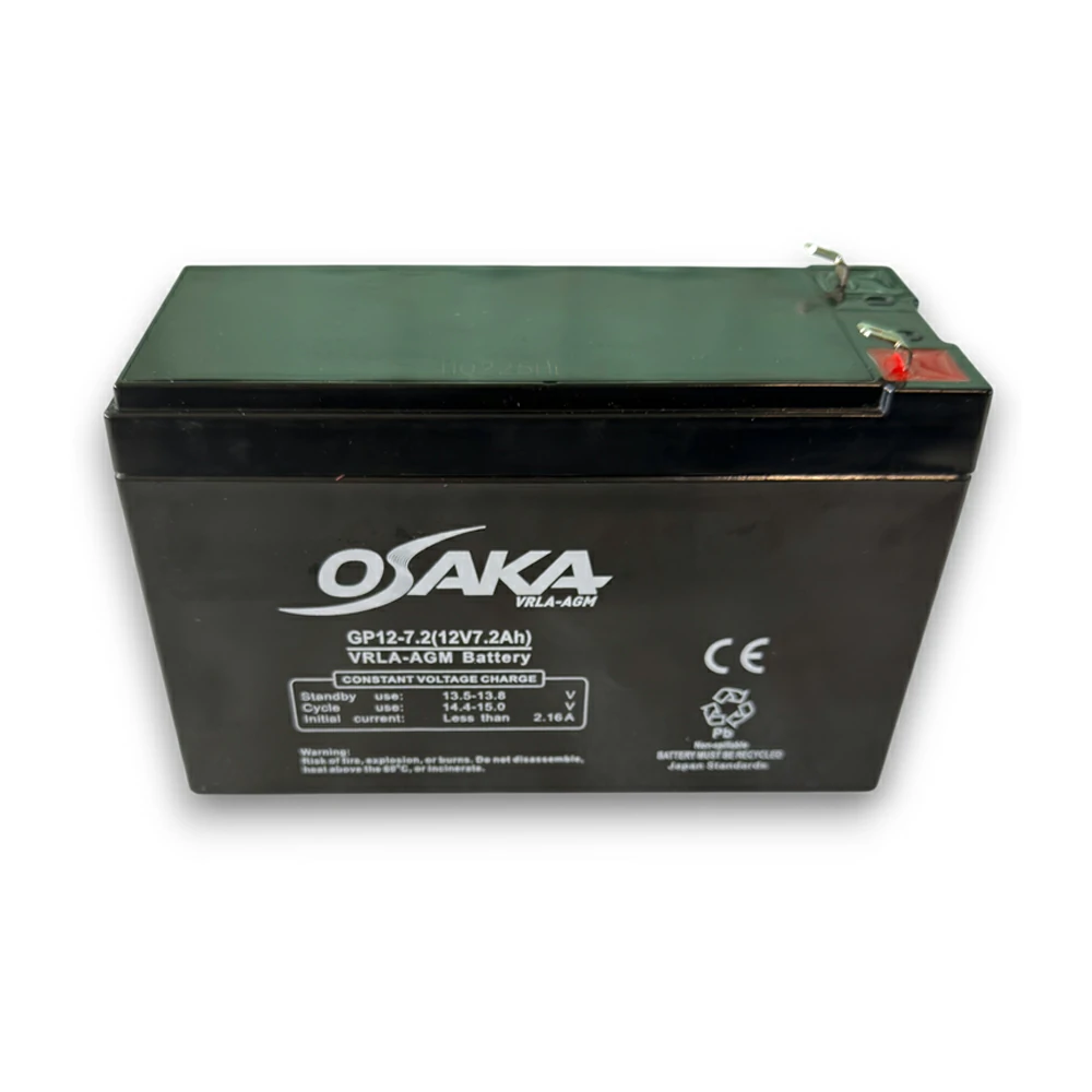 Η Osaka GP12-7.2 | 12V-7.2Ah | F1 είναι μια αξιόπιστη μπαταρία κλειστού τύπου VRLA/AGM (Valve Regulated Lead Acid – Absorbent Glass Mat), ειδικά σχεδιασμένη για εφαρμογές γενικής χρήσης, συστήματα ασφαλείας και UPS μικρής ισχύος. Με ονομαστική τάση 12V και χωρητικότητα 7.2Ah, προσφέρει σταθερή απόδοση, ασφάλεια και μεγάλη διάρκεια ζωής, καθιστώντας την ιδανική λύση για συσκευές που απαιτούν αδιάλειπτη παροχή ενέργειας.