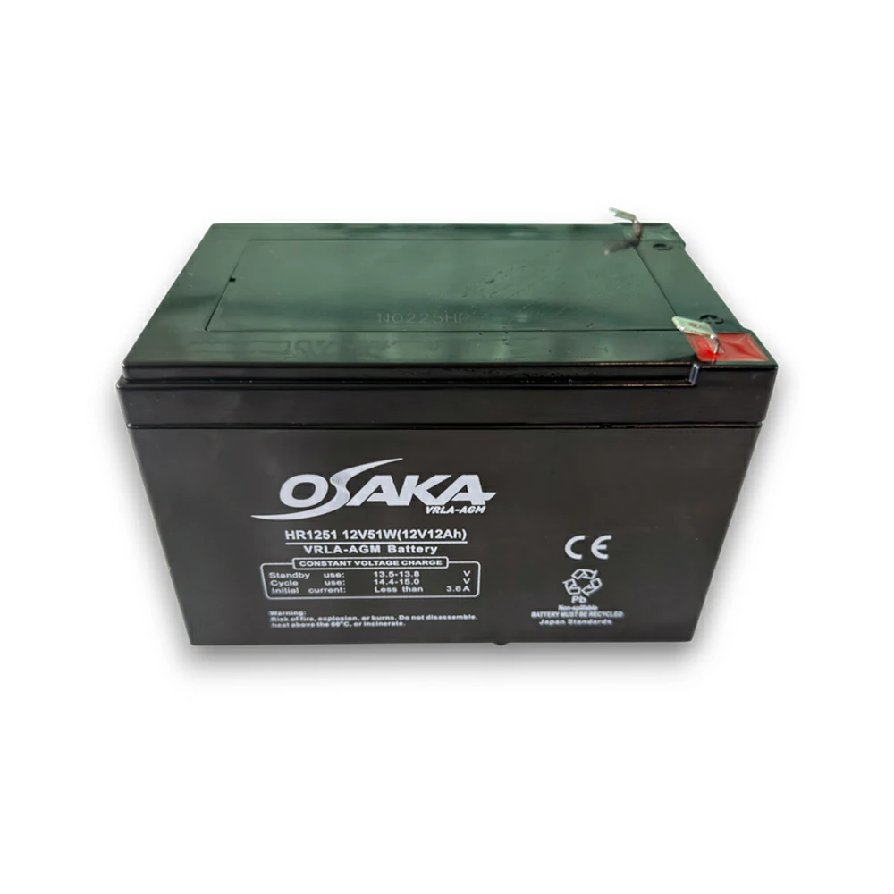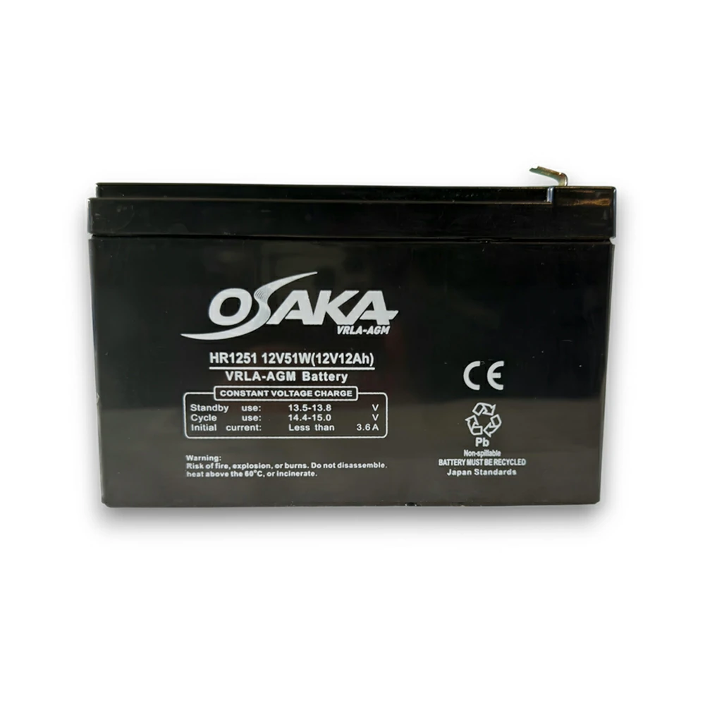 Η Osaka HR1251 | 12V-12Ah | F2 είναι μια αξιόπιστη και αποδοτική μπαταρία VRLA AGM (Valve Regulated Lead Acid – Absorbent Glass Mat), σχεδιασμένη για απαιτητικές εφαρμογές υψηλού ρυθμού εκφόρτισης. Με ονομαστική τάση 12V και χωρητικότητα 12Ah / 51W, αποτελεί ιδανική λύση για UPS, συστήματα ασφαλείας, τηλεπικοινωνιακό εξοπλισμό και κάθε εφαρμογή που χρειάζεται αξιόπιστη και σταθερή παροχή ενέργειας.
